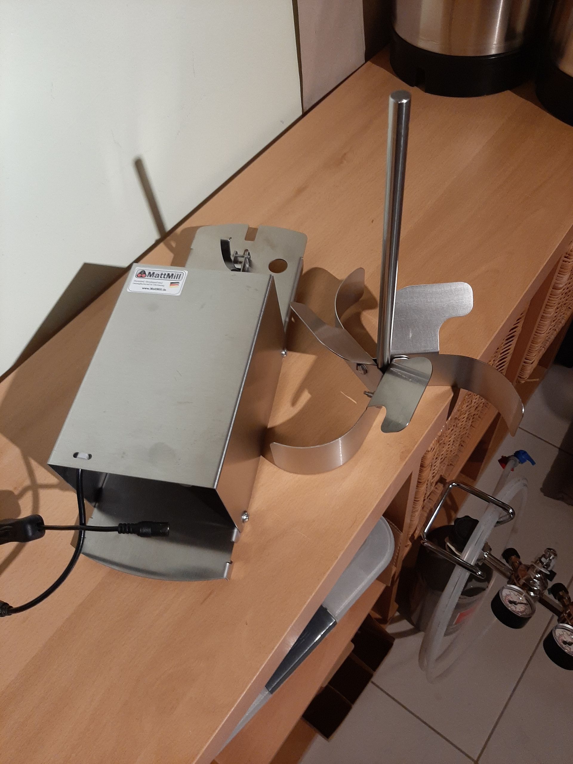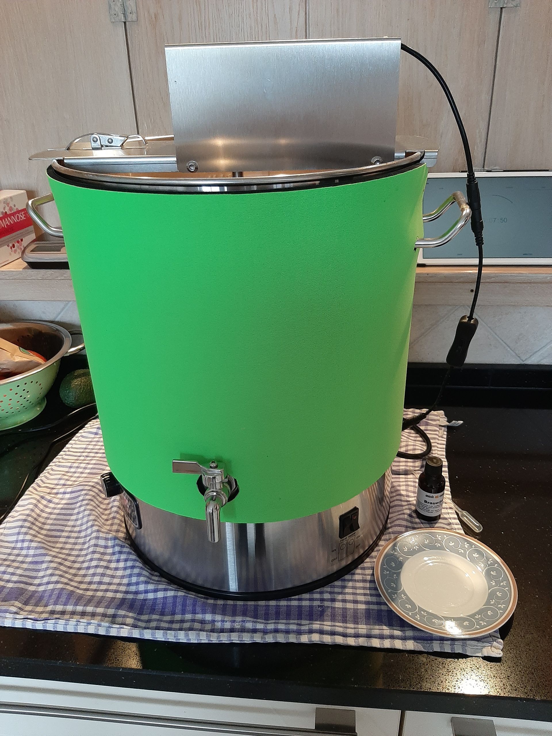 Brewferm 30l, Edelstahl, 700W/1800W Heizung, hier im geschmackvollen Neo(n)prenmäntelchen und Rührhexe drauf