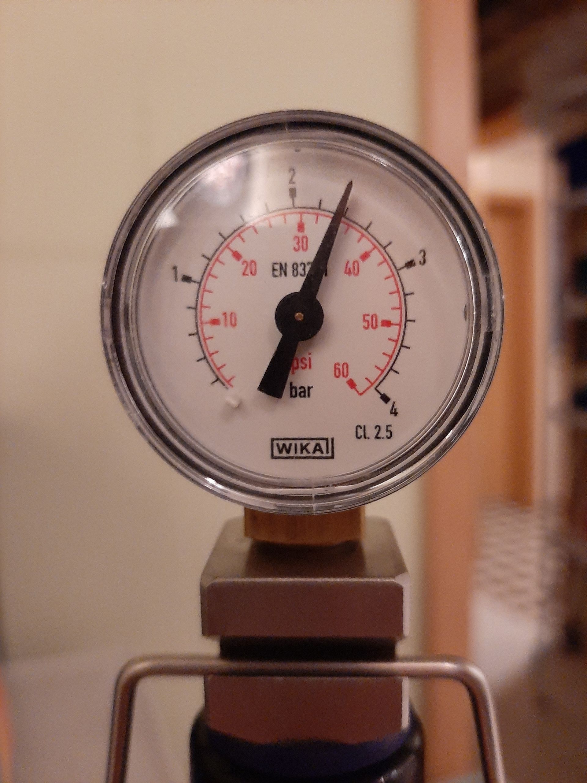 Das Ding mit den roten Aufklebern, (das andere ist natürlich das Keg :-p) mit zweileitigem Druckminderer.