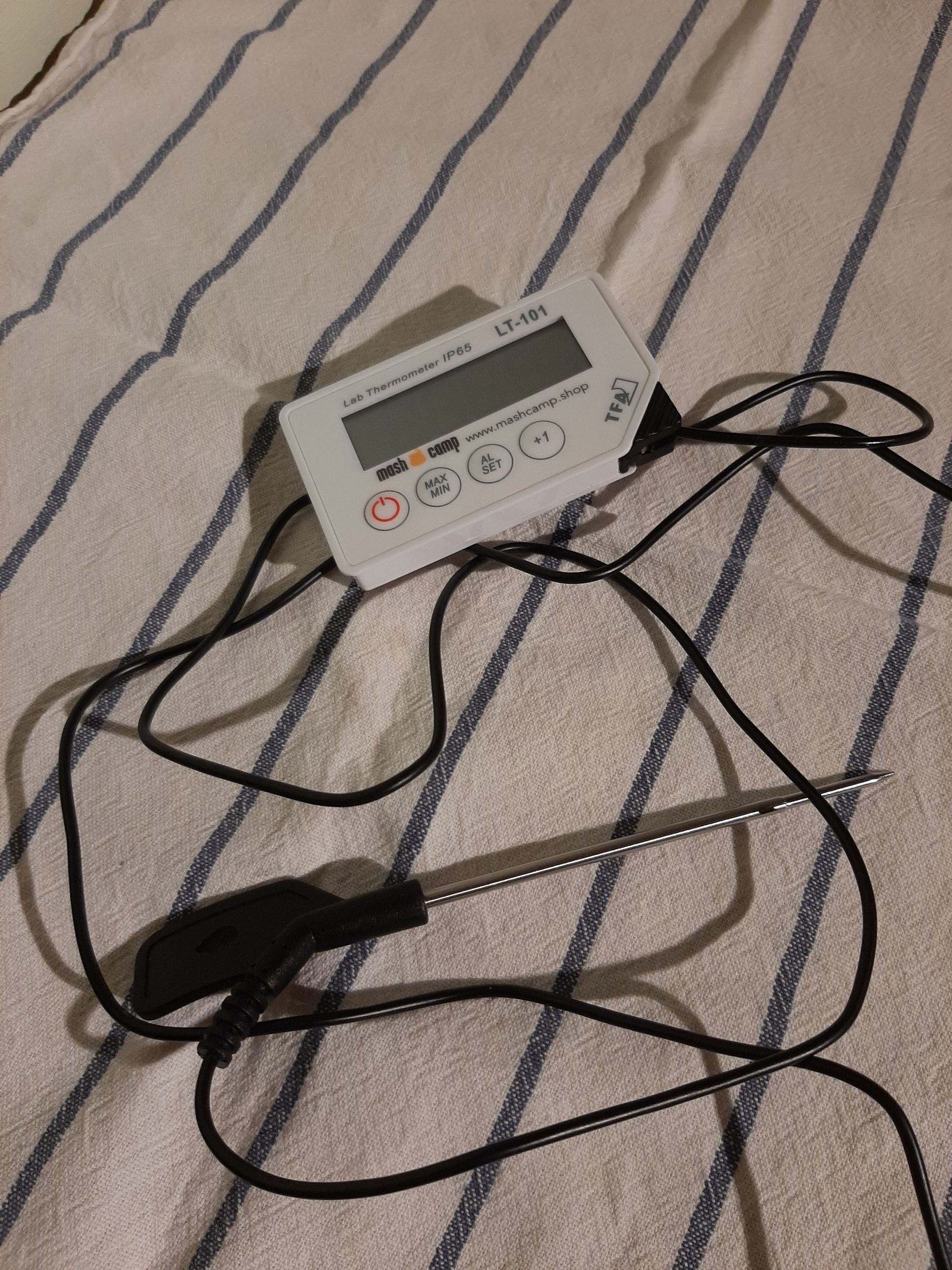 vernünftiges Thermometer muß sein. Das hier hat einen Magnet auf der Rückseite des Gehäuses, damit kann ich es an die Dunstabzugshaube in der Küche hängen und habe es so immer im Auge.